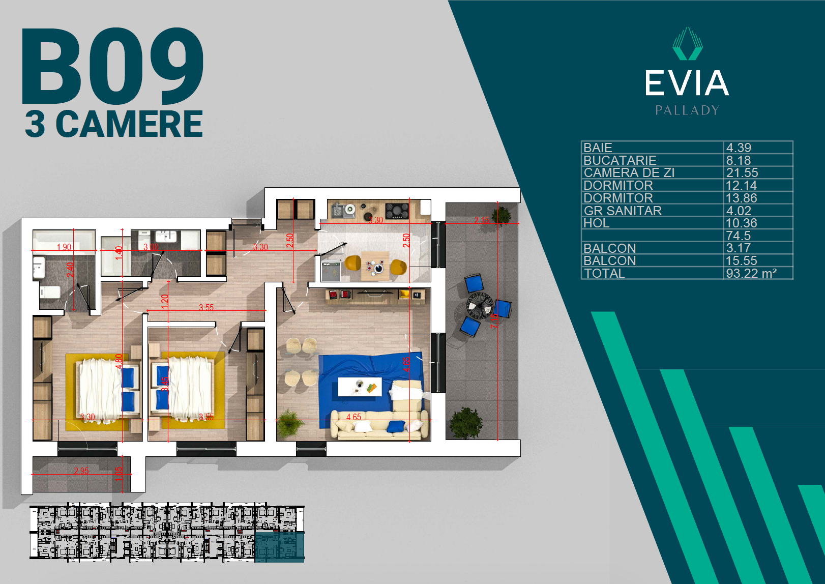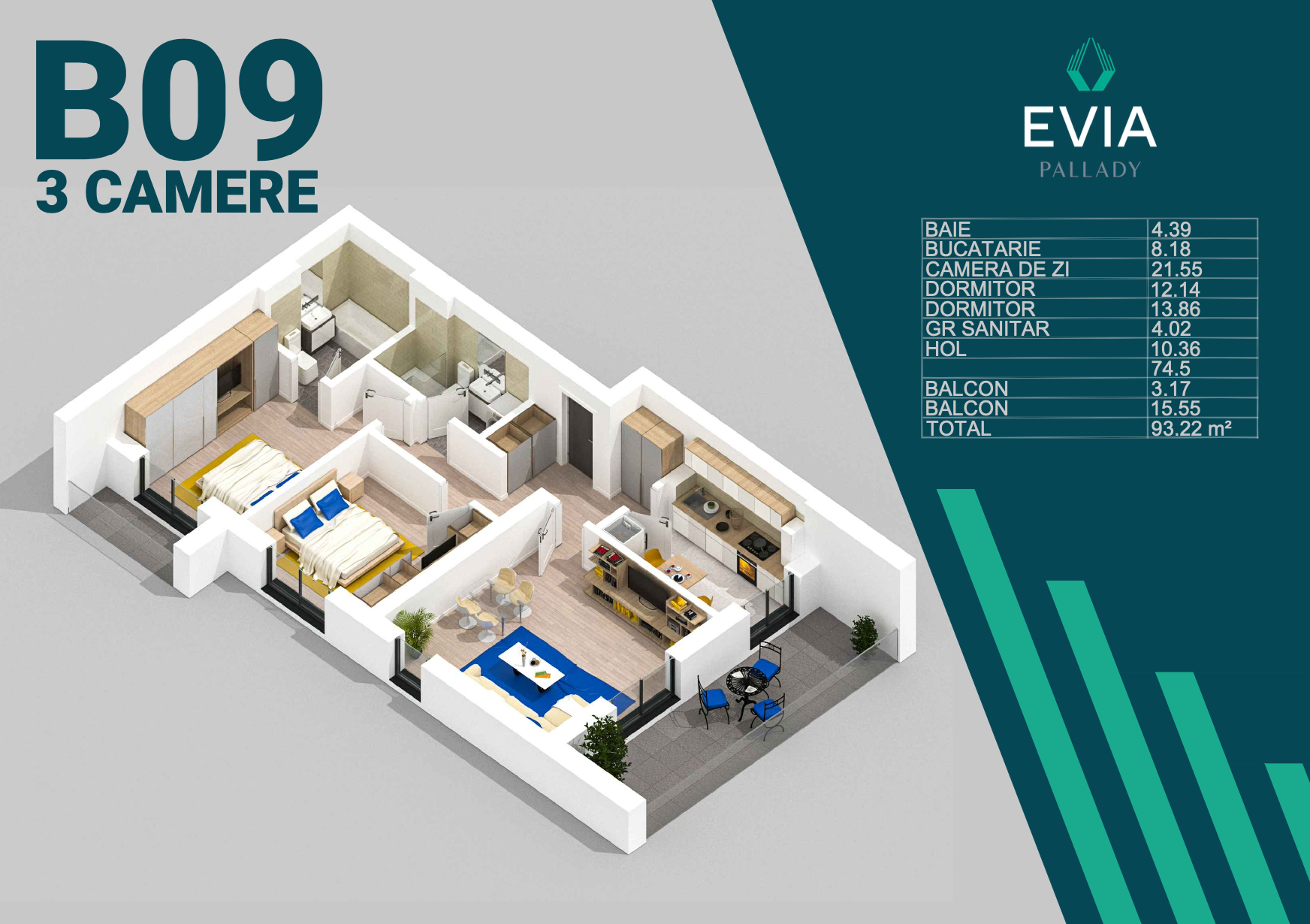 Apartament localizat în ansamblul Evia Pallady, în proximitatea stației de Metrou Nicolae Teclu. Apartamentul se predă cu toate finisajele montate - gresie, faianță, parchet, uși interioare și ușa exterioară, baia complet mobilată, centrala termica 24kw în condensație, încălzire prin pardoseală.